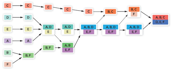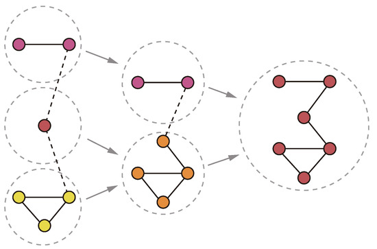 As a special kind of community evolution process, the community evolution process of bottom-up cohesion is used to represent the evolution process of constant merging of communities over time, as shown in Figure 3.
