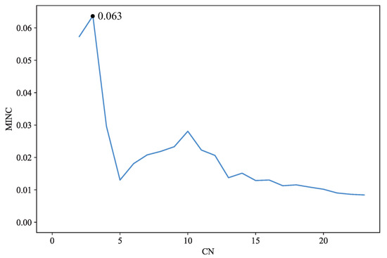 Figure 5 shows the MINC values of the first 20 states in the community evolution process constructed on Polbooks [26] network, with the abscissa indicating the corresponded CN values of the states. As shown in the figure, with the largest MINC value, the state with 3 communities will be output as the result partition.