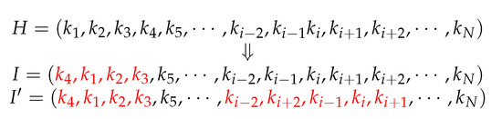 The shift operator is a process in which genes in some substrings of a chromosome are shifted backward successively, while the last gene in the substring is shifted to the foremost location. The substrings whose genes are shifted in a chromosome and their length are selected randomly. The gene shift can be divided into single-point shift and multi-point shift. As to single-point shift, only one substring of a chromosome is selected for gene shift, and in multi-point shift, multiple substrings of a chromosome are selected for gene shift. The process of the shift operation is shown in Figure 2. H is a chromosome including multiple genes . I and are chromosomes obtained by implementing single-point shift and multi-point shift operations for H, respectively.