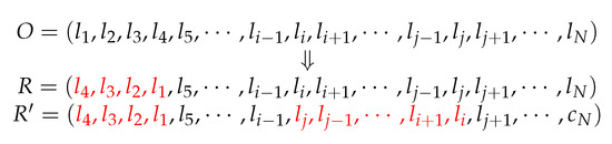 The inversion operation is a process where the genes in some substrings of a chromosome are inversed successively at a specific probability. The substrings for gene inversion in a chromosome and their length are selected randomly. The gene inversion can also be divided into single-point inversion and multi-point inversion. As to single-point inversion, only one substring of a chromosome is selected for gene inversion, and for multi-point inversion, multiple substrings of a chromosome are selected for gene inversion. The operation is shown in Figure 3. We assume O is a chromosome including multiple genes . On the basis of the operations of single-point and multi-point inversions for chromosome O, we can obtain the chromosomes R and .