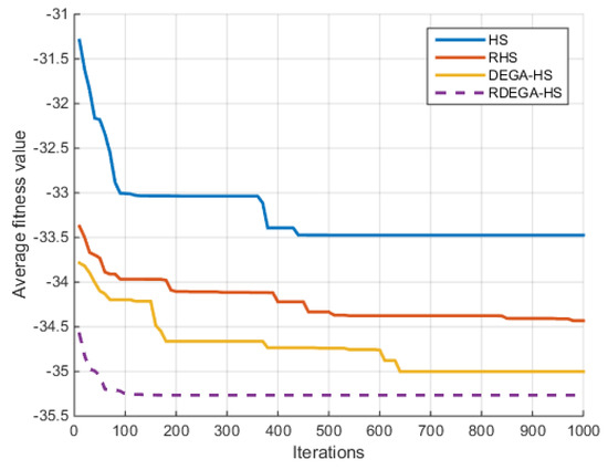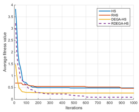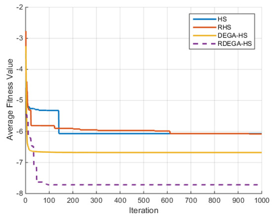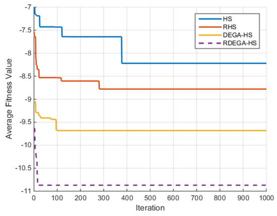 It can be seen from the comparison of the optimization results of the test functions in Table 4, Table 5, Table 6, Table 7, Table 8 and Table 9 and the changes in average fitness in Figure 4, Figure 5, Figure 6, Figure 7, Figure 8 and Figure 9 that the proposed algorithm has a strong optimization ability. Upon a general review of each algorithm’s optimization process for the above six functions, the dimensions of the functions had a significant influence on the optimal value. As the dimensions increased, the optimal value of each algorithm also changed. For example, for the Ackley function, the variable dimensions had a significant influence on each algorithm. In terms of a low-dimensional function, RDEGA-HS and the other algorithms were all able to achieve the global optimum; however, in terms of a high-dimensional function, the RDEGA-HS algorithm still achieved a satisfactory result.