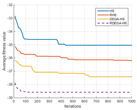 Since five sub-harmony memories have been designed and calculated for RDEGA-HS, the running duration is longer than an algorithm where a single-harmony memory is set. However, as the diversity of harmony memories is increased, the local optimal solutions are avoided, thus improving the solving accuracy.