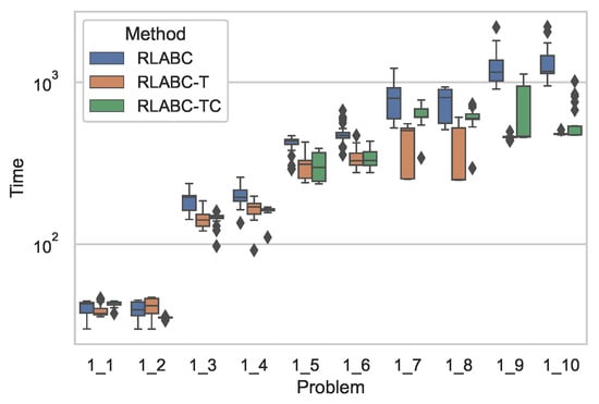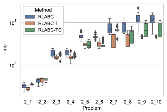 Comparative results with respect to computational time by all three (RLABC, RLABC-T, RLABC-TC) algorithms for Set2 benchmarks.