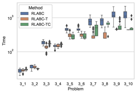 Comparative results with respect to computational time by all three (RLABC, RLABC-T, RLABC-TC) algorithms for Set3 benchmarks.