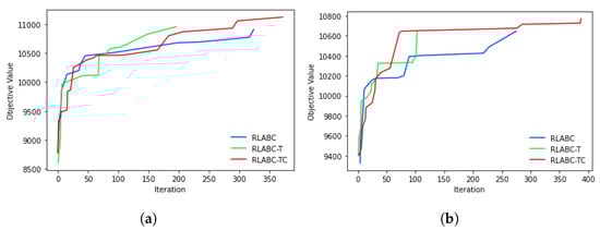 Figure 5 presents the convergence graphs of methods through the search process; Figure 5a shows the algorithms’ behaviour on a 400-dimensional problem, , and Figure 5b plots the performances on a 500-dimensional problem, . As can be seen in both figures, RLABC-T converges quicker than the other two but remains in local optima at around iteration 200. Meanwhile, RLABC-TC escapes that local optima in iterations such as 200, 300, and 350 in Figure 5a and in iterations around 80 and 250 in Figure 5b. On the other hand, RLABC gradually converges but stops after iteration 300 in both Figure 5a,b. This suggests that it is able to escape local optima at that points but cannot converge as RLABC-TC does. Both figures clarify that RLABC is outperformed by the other algorithms, while RLABC-TC converges better among all.