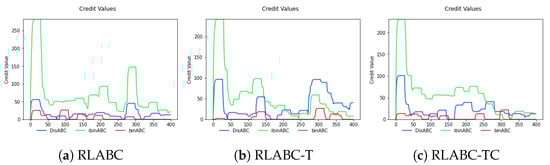 The change of credit levels gained by each operator while solving some benchmark instances through iterations; (a) credits gained with the RLABC algorithm, (b) credits gained with the RLABC-T algorithm, and (c) credits gained with the RLABC-TC algorithm.
