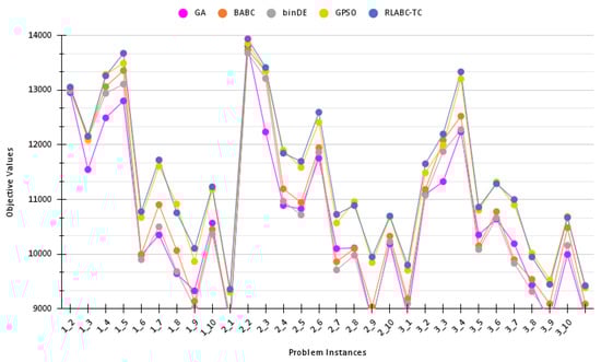 The outperforming algorithm among three is RLABC-TC, which transfers previously gained experience into new runs and keeps learning active. It has been compared with some recently published very competitive state-of-art works—labelled as GA [], BABC [], binDE [], and GPSO []—and the comparative results are plotted in Figure 7 on which all benchmark instances of the three sets have been considered, as shown on the horizontal axis of the graph, while the quality of the solution is indicated on the vertical axis. As a maximisation problem, the highest mean value is always delivered by RLABC-TC, which demonstrates the strength of the proposed approach.