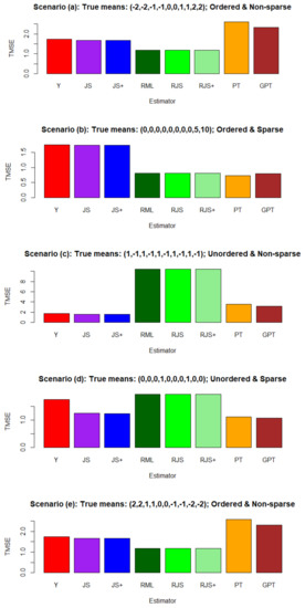 In Scenarios (a) and (e), the smallest TMSE values were achieved by , , and , which appropriately accounted for the ordered means. Thus, these ordered mean estimators provided some advantages over the standard estimator . Here, users needed to specify the option “decreasing = FALSE” (Scenario (a)) or “decreasing = TRUE” (Scenario (e)) to capture the true ordering of the means. On the other hand, and produced unreasonably large TMSE values, since they wrongly imposed the sparse mean assumptions.