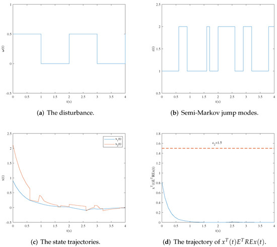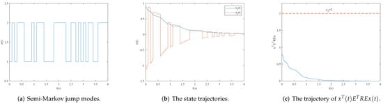 With this control law, when the semi-Markov jump mode is as Figure 1a, the state trajectories of closed-loop SSMJS are as in Figure 1b, and the evolution of is presented in Figure 1c.