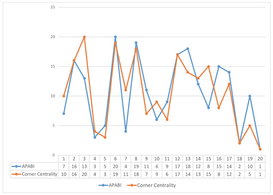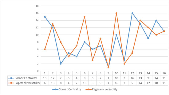 Finally, we obtained the corner centrality measure by using Equation (12). For our example, the score was