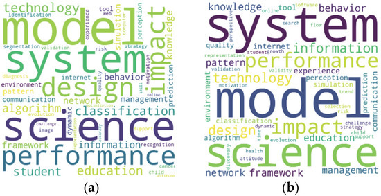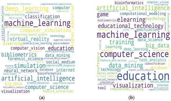 In Figure 5a, the 50 authors’ keywords that appeared in the highest number of papers are presented. Moreover, the 50 author’s keywords with the highest corner centrality are on Figure 5b. In these word clouds, the size of the word is related to the value given. Therefore, the ranking given by corner centrality distinguishes between the words with high importance, such as education (first place), machine learning (second place), and computer science (third place).
