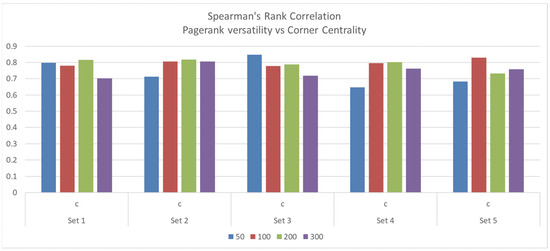 We created five sets of multilayer networks composed of 50, 100, 200, and 300 nodes. Every multilayer network obtained the node’s ranking given by the Pagerank versatility method and the corner centrality measure. To test the correlation between the two rankings, we applied Spearman’s Rank Correlation, finding the correlation () and how likely or probable it was that any observed correlation was due to chance ().