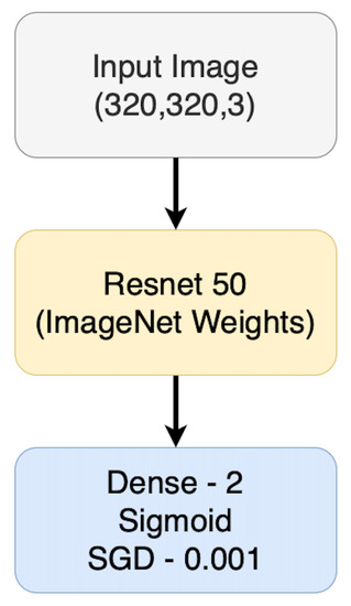 The goal of this work is to reduce the physician time needed to read the VCE videos; thus, our framework focused on removing confidently predicted normal frames which are not needed for diagnoses. Before training a model, we had to pre-process the videos by separating each into frames using the five frames per second speed of the MP4 files. All frames contain a time code in the top corner as seen in Figure 1, which are what the physician uses to denote the location of any abnormalities. The ground truth for this data is a list of segments with a start and ending time of when the abnormality is visible in the video. To provide the label for each image, we used optical character recognition to read the time code and determine if the frame was indicated as abnormal by the physician. The final step before training the deep learner was to remove the time code and IntroMedic text from the images as seen in Figure 2, to prevent the model from seeing this information and using it to make predictions. We decided to use a well-known and robust convolutional neural network architecture, ResNet50 [32], which has been trained to achieve high performance on various classification benchmark datasets. ResNet50, with initial weights from training on ImageNet [33], was fine-tuned with the KID videos dataset. The classification layer of ResNet was replaced by a single fully connected layer with two neurons as seen in Figure 3. This output layer used a sigmoid activation function to classify the frames as either normal or abnormal. All models were trained using stochastic gradient descent as the optimizer using a learning rate of 0.001 with class weights to account for the abnormal frames being a minority.