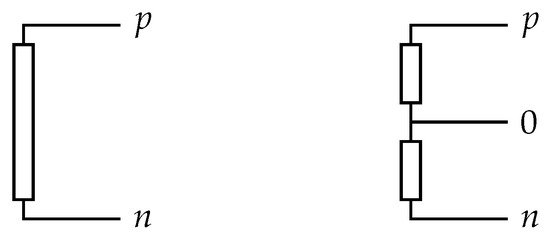 The bipolar DC grid is represented by an oriented graph , where = {1,2,…,l} is the set of hypernodes and is the set of hyperbranches. Each hypernode and hyperbranch has three components represented by the set = {p,o,n}; these contain the positive, neutral, and negative poles. In this manuscript, the subscripts k and m are entries of , and the electrical connections are represented by the nodal conductance matrix Gbus. Capital letters represent vector variables or constants, while capital bold letters represent matrix variables or constants, and their entries are lower-case letters. The main variables, constants, and indices are presented in the nomenclature below. In the present work, we call the loads connected between a positive and negative pole a C-type connection, and we call the loads connected between a positive and neutral pole an E-type connection (see Figure 2).