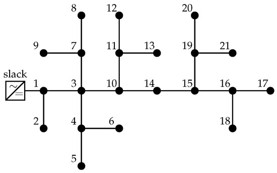The 21-bus grid has a radial configuration with a voltage output in the slack node of kV and with V in the neutral point. The complete parametric information for this test feeder is listed in Table 2.