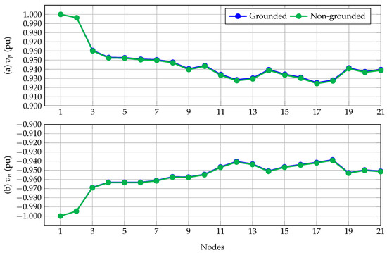 Considering that the solution reached by the hyperbolic approximation took fewer iterations and ensured the same numerical results as those of the successive approximation power flow method with fewer iterations, here, we only present the results reached by our proposal. Table 6 presents the voltage profile performance for the 21-bus grid in the solidly grounded and non-grounded simulation scenarios.