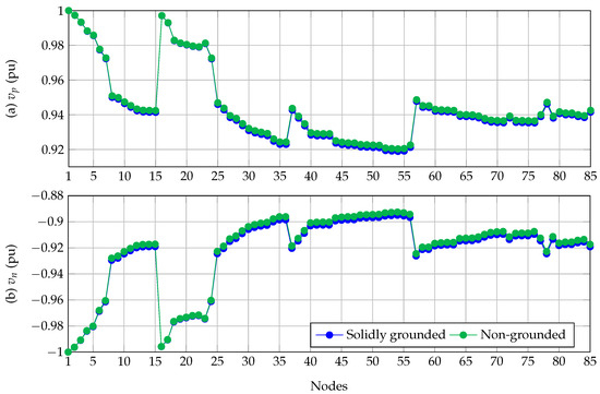 Voltage behavior for the 85-bus grid considering a solidly grounded or non-grounded neutral wire.
