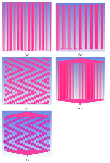 Flow channel design. (a) 2-Serpentine. (b) 3-Serpentine. (c) Serpentine zigzag. (d) Straight zigzag. (e) Straight zigzag.