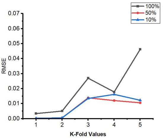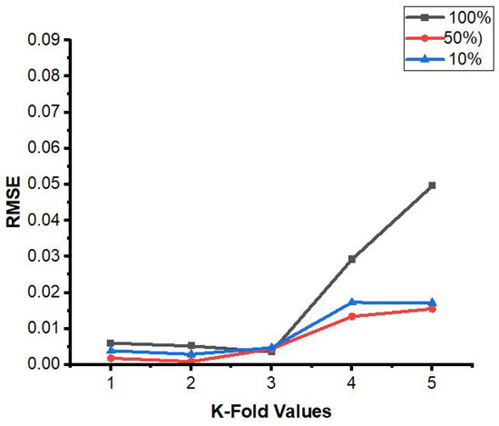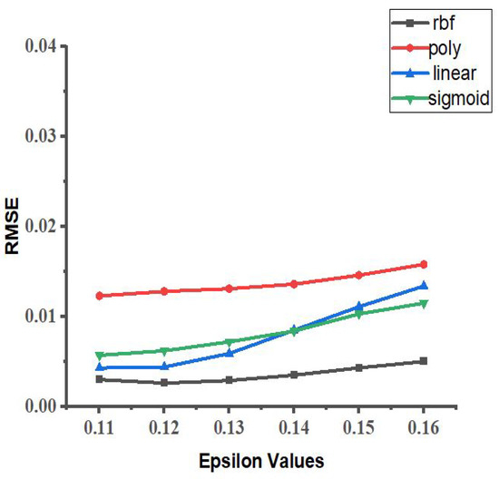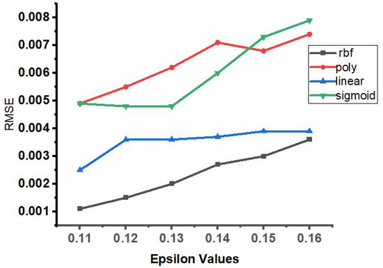 The support vector machine regression method was tested with various learning parameters. An epsilon is the loss function for SVMR. The model was tested with various values, which range from [0.11, 0.12 …0.16]. The result illustrated in Figure 3. shows that 0.12 is the optimal value for predicting cell voltage by using SVMR (Table 2). The experiment was stopped at 0.16 (Table 3). as there is an increase in error value. In addition to this test, the experiment was conducted with various kernel functions to identify the optimal kernel function (RBF, poly, linear, sigmoid) for the data. The kernel functions help to solve the complexity of the data [38]. It is necessary to select optimized function for data. It is observed that the kernel function RBF gives better result as listed in Table 4 when compared to other functions. Figure 4, Figure 5 and Figure 6 illustrate the comparison of various kernel functions with humidity levels of 10%, 50%, and 100% (Table 5). The training of the SVM regression model turns out to be the most expensive, as it necessitates the cross-validation tweaking of three hyperparameters. The results show that the 100% humidity level gives better results, as depicted in Figure 7.