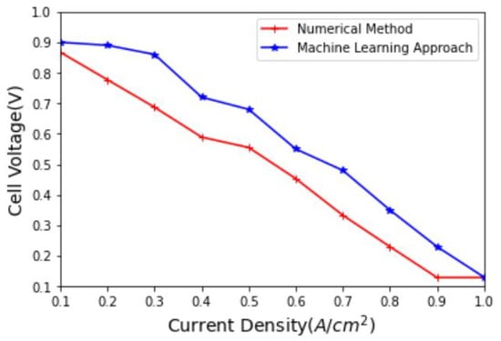 The results observed that the machine learning model predicts an output voltage of 0.88 at the greatest power density point, which closely matches with the prediction by numerical models, as illustrated in Figure 12.
