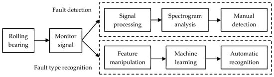 The purpose of rolling bearing fault diagnosis is to determine the bearing health status by analyzing the collected operation data. Diagnostics of faults revolve primarily around fault detection and fault type identification. Figure 2 shows the general flowchart of fault detection and fault type recognition. Although fault detection and fault type recognition may have some overlap, they are two different types of tasks in fault diagnosis. Specifically, fault detection is to detect faults or non-faults from the collected data, and fault type recognition is to recognize faults and their types from the data. Therefore, to solve these two tasks, different procedures are often used. For fault detection, the collected bearing signals are utilized to determine bearing status. The process often includes removing the noise and harmonic interference from the monitoring signal using signal processing methods and then manually identifying the fault by finding its characteristic frequency. Fault type recognition refers to using the existing bearing signals to construct a diagnostic system to evaluate the unknown bearing signals. Unlike fault detection, fault type recognition methods automatically extract or construct fault features from the signals and determine the bearing health status using machine learning algorithms.