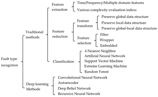 This survey paper summarizes the fault diagnosis methods of rolling bearings based on vibration signals from the perspectives of fault detection and fault type recognition. First, four types of signal processing methods commonly used for fault detection of rolling bearings, i.e., morphological transformation-based methods, filter-based methods, decomposition-based methods, and deconvolution-based methods, are discussed. Then, the classical fault type recognition methods are discussed from three aspects: feature extraction, feature reduction, and classification. In addition, the recently popular deep learning based-fault type recognition methods such as convolutional neural networks, Autoencoder, deep belief networks, and recursive neural networks, are also discussed and reviewed. The taxonomy of this survey is shown in Figure 3.