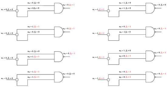 As such, the valid configurations around a gate are split by what the inputs before considering the fault status are (If they differ from this value, there must be an associated fault on this input.) and what the output after considering the fault status is (i.e., the same situation as for the circuit at large). Table 1 gives a full description of all the valid subconfiguration spaces for an NAND gate, where the first element in each entry is the trivial valid configuration that exists for every subcircuit (or the whole circuit) by applying the faults on the outputs only (i.e., all wires are healthy, except the outputs that disagree with the logical value they should have).