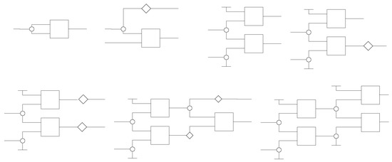 For the purpose of our discussion in this paper, we consider gates that are one-input/one-output, two-input/one-output, or one-input/two-output. One-input/one-output gates are an identity gate ID or an inverter gate INV. Two-input/one-output gates are OR, AND, XOR, NOR, NAND, or XNR. One-input/two-output gates are a fan-out gate FAN, a fan-out gate with an inverter on the first output F10, a fan-out gate with an inverter on the second output F01, or a fan-out gate with an inverter on both F11.