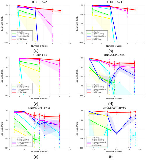 Approach 3 also showed striking performance differences between instance sizes, especially for LINANGOPT with and LINCOEFOPT with . Approach 3 is initialized to a computational basis state with faults on the outputs, and so the distance, in terms of the number of mixing operators, to find a minimum state as well as the degeneracy of the solution space may play a more acute role compared with other approaches. For example, as noted in Section 5, the instances with 13 wires had instances with higher degeneracy than that at lower sizes. This typical degeneracy growth with the problem size for the circuits of interest is one reason leveraging quantum algorithms may be beneficial.