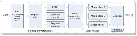 In 2007, Potamitis, Ganchev, and Fakotakis [7] attempted to classify species of crickets and cicadas using their acoustic signals with a probabilistic neural network (PNN) and Gaussian mixture models (GMM). The dataset consists of audio recordings of 220 species of crickets and cicadas obtained from the Singing Insects of North America (SINA) collection. The recognition process has two main stages, which are signal parameterization and classification. Figure 1 shows the detailed steps of the acoustic insect recognition process. This experiment obtained a high accuracy of 99% and above for classifications at levels of singing insect and family and 90% for classification at species level using the fusion of PNN and GMM. However, the identification accuracy of this fusion was found to be insufficient for practical applications despite the performance gain.
