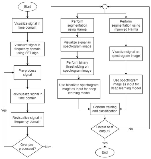 After that, the signals were converted to spectrogram representation to be passed as input to the deep learning model to perform training and classification. Two sets of spectrogram images processed in different ways, namely binarized spectrograms and the spectrograms obtained from the improved Härmä algorithms, were trained separately, and the performances of the models were evaluated. We checked if the model obtained the best output, i.e., obtained a high classification accuracy without overfitting, and made some modifications if the output was not satisfactory.