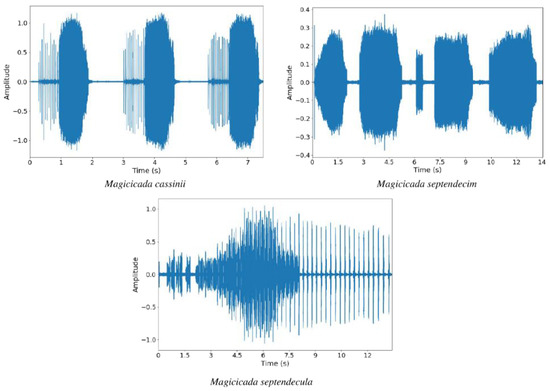 The dataset used in this experiment was collected from various online sources, such as Freesound and other websites. There is no readily available dataset for cicada species. The dataset consists of a total of 43 sound recordings of three different cicada species, namely Magicicada cassinii, Magicicada septendecim, and Magicicada septendecula. The Magicicada cassinii and Magicicada septendecula species each has 14 audio files while Magicicada septendecim has 15 audio files. All sound recordings were recorded in mono at a sampling rate of 44.1 kHz. Figure 3 shows some samples of the waveform of sounds of each species, while Table 1 shows the details of the audio recordings used in this paper.