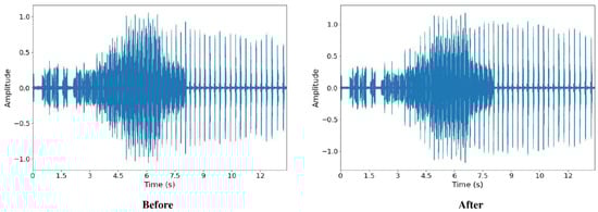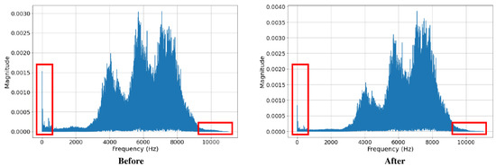 The dataset was pre-processed by denoising the audio signals using the Butterworth filter. Both high pass and low pass filters were applied to the audio signals. The low pass filter was applied with a cut-off point at 10 kHz, while the high pass filter was applied with a cut-off point at 1 kHz. After denoising, the noises with frequencies above 10 kHz and below 1 kHz were mostly removed from the audio recording (Figure 4).