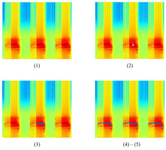 In the following iterations, the value remained unchanged while the value of was updated using (3). The algorithm then checked if is greater than or equal to . If true, the algorithm proceeds with the next step. Else, the algorithm ends. Figure 7(2) shows the output of this step. The white marker shows the position of in the spectrogram.
