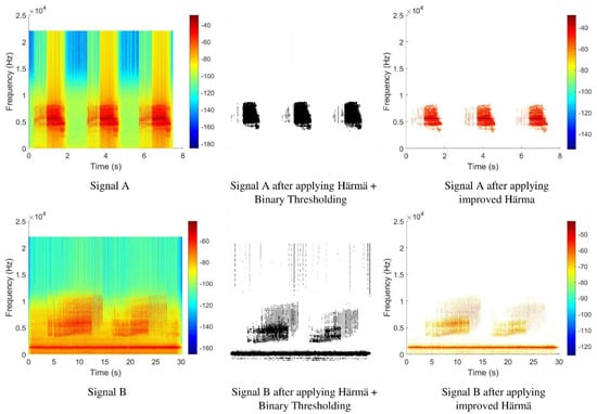 Figure 8 shows the spectrogram images of two different signals, Signal A and Signal B, before and after applying the Härmä algorithm and binary thresholding. By comparing the spectrograms of Signal A before and after processing, it was shown that most of the unnecessary information was successfully removed after applying the thresholding technique. However, the straight line appearing at the center of the binarized spectrogram that represents very low-amplitude signals was not removed due to its original blue color, which is above the threshold value.