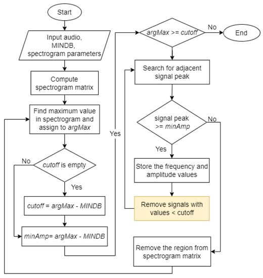 Steps 2 to 4 were repeated until the maximum value in the spectrogram matrix at that iteration, , is lower than .