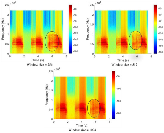 Thus, the window size was increased to 512 points and 1024 points to capture the short syllables in the signal. The spectrograms generated using the two window sizes were able to capture a clearer and more complete short syllable as compared to the spectrogram image generated using a window size of 256 points. However, if observed carefully, when using a window size of 1024 points, more background noises were captured than the other window sizes.
