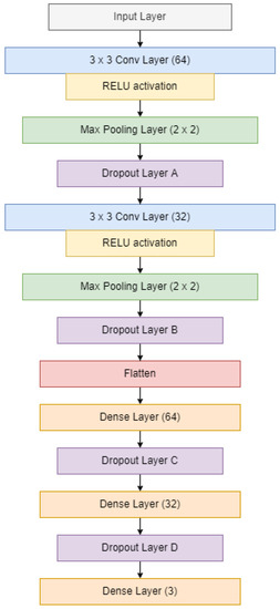 Since the dataset for this research was small, a simple CNN model was built to classify the audio signals of the three cicada species. The first layer was the input layer, which takes in spectrogram images with dimensions h × w × r, where h, w, and r represent the height and width of the image, and the number of channels, respectively. The input was passed to two sets of convolutional layers, max-pooling layers and dropout layers. Then, the output was passed to the fully-connected layer and then flattened into a one-dimensional array. The array was passed to the dense layers with 64 and 32 filters, each followed by a dropout layer. Lastly, the output layer with the Softmax activation function was used to predict the class of the input sample. Figure 11 shows the architecture of the CNN model.