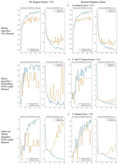 Several experiments were conducted using different variations of the dataset, including the dataset after applying Härmä syllable segmentation (Härmä), Härmä with binary thresholding, and the improved version of Härmä, on both the Full-Length Dataset and the Cut Dataset.