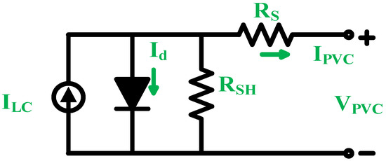PV cell is a fundamental unit that uses the photovoltaic effect to turn solar energy into electrical energy. When exposed to sunlight, the PV cell generates electrical energy. The equivalent circuit of a typical PV cell contains series and shunt resistances, as presented in Figure 1. The single diode model is the most accurate of the many PV cell modeling methods. The KCL can be used to obtain the PV cell output current, IPVC [78] as follows: