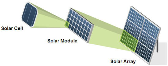 A standard PV cell only produces 0.6 V, which is extremely low, so many cells are usually connected in series and parallel to form a PV module (panel) to raise the voltage to a level appropriate for the application, as shown in Figure 2. A typical rooftop solar panel has 60 cells, resulting in a 36 V open circuit voltage. To increase the system voltage, multiple panels (or modules) are connected in series for larger systems [79]. Parallel connections of modules can be present in an array of multiple solar panels, but parallel connections make sense only if the voltage is small. A series connection raises the voltage while holding the current constant, while a parallel connection raises, the current while keeping the voltage constant. Series connection is more effective than parallel connection because losses increase as the current increases.