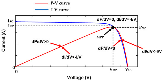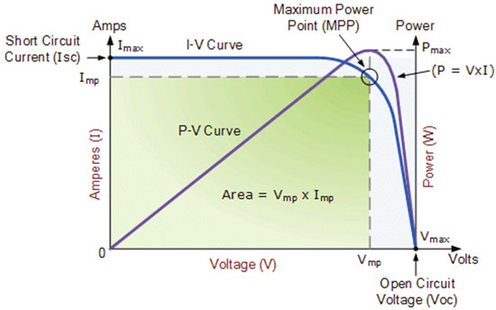 Generally, the PV panel characteristics are described by I-V and P-V curves, as presented in Figure 3. It is worth noting that there is a specific operating point at which the output power is at its maximum. This unique point is referred to as the maximum power point (MPP) and is denoted by the letters MPP in the I-V and P-V curves. Due to the PV panel’s low efficiency, PV systems must always operate close to the MPP in order to gather the greatest amount of energy [80,81].