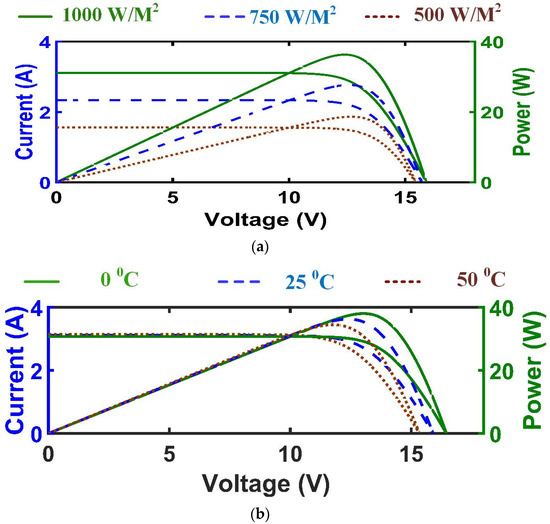 However, the performance of the PV panel can easily be affected by climatic conditions. The short circuit current is linearly dependent on the solar irradiance level, whereas the open-circuit voltage is strongly influenced by the cell temperature [82,83]. Figure 4a depicts the PV characteristics for changing irradiance and Figure 4b depicts the PV characteristics for changing temperature.