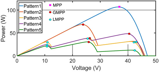 The performance of the PV array is also affected by the change in irradiance from panel to panel due to shadows of passing clouds, trees, nearby buildings, changes in climate, disposition of dust, the aging effect of the panel, etc [84,85]. Therefore, partial shading conditions (PSC) can occur in the PV system due to any of the above reasons. When the PSC takes place in the PV system, the voltage–power (V-P) curve produces the only peak or multiple peaks [86,87,88,89,90]. This single peak and multiple peaks on V-P curves depend on sunlight irradiances on the panels of the PV system. If all the PV panels receive the same irradiance, then there is only a peak on the P-V curve. If the PV panels (one or two or all) face the shadow effect, then there are multiple peaks on the P-V curve of the PV system. Figure 5 shows the P-V curves of the PV system under various shading conditions. As a result, the operating point that meets the MPP criterion also changes depending on the ambient conditions. For maximizing the power output of PV systems, an MPPT mechanism, which is a control algorithm that can constantly track the MPP during operation, is required [91].