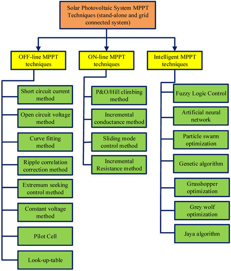 - Ali, A.; Almutairi, K.; Malik, M.Z.; Irshad, K.; Tirth, V.; Algarni, S.; Zahir, M.H.; Islam, S.; Shafiullah, M.; Shukla, N.K. Review of Online and Soft Computing Maximum Power Point Tracking Techniques under Non-Uniform Solar Irradiation Conditions. Energies 2020, 13, 3256. [Google Scholar] [CrossRef]