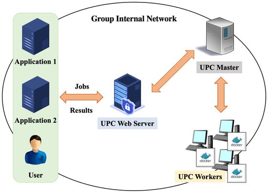 First, we review the UPC system. The UPC system can provide computational powers efficiently for members in a group, such as engineers in a company or students in a laboratory, by using idling computing resources of their PCs. To allow various application programs to run on different PC environments, the UPC system adopts Docker. Docker is a popular software tool that has been designed to create, deploy, and execute various application programs on various platforms by packaging the necessary dependencies of the application [].
