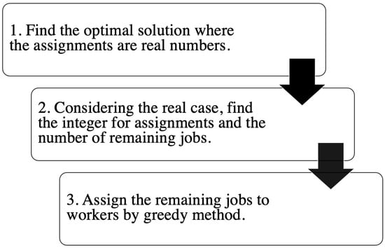 The solution in the first step becomes feasible only when is a multiple of for type t. Unfortunately, does not satisfy the condition, in general. Therefore, in the second step, as the closest integer number to satisfy the condition, the following jobs will be assigned to the worker (worker w), where gives the largest integer equal to or smaller than y: