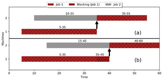 Moreover, in several manufacturing systems, there exist production processes where no intermediate buffers exist between machines due to technical requirements or process characteristics. In the context of the JSSP, this implies that a job that completes processing on a machine has to remain on the same machine until the next machine in sequence is available for processing. Since the job cannot leave the machine that it is executing on, it effectively blocks the machine by not allowing other parts to enter it. In the literature, this is referred to as a blocking condition, which this study is also concerned with. Figure 1 presents an example of a blocking condition where job 1 (processing time of 30 units) needs to be processed on machine 1 followed by machine 2. We see in Figure 1a, if machine 2 is available to load and start executing job 1 when job 1 completes, then job 1 immediately moves to machine 2. Machine 1 is now available for other incoming jobs. However, if machine 2 is busy when job 1 is ready to move (Figure 1b), then job 1 stays on machine 1 thereby blocking it until machine 2 becomes free. Hence, machine 1 is also blocked for the time period that job 1 stays on it.