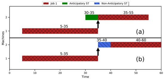 In the literature, job-shop problems usually consist of two types of sequence-dependent setup times [35,36]. These are anticipatory setup times (AS) and nonanticipatory setup times (NS). For the case of AS, the setup can begin even if the job is not yet available to be processed but the machine that it is going to be processed on is idle, whereas for NS, the setup can begin only if both job and machine are available.