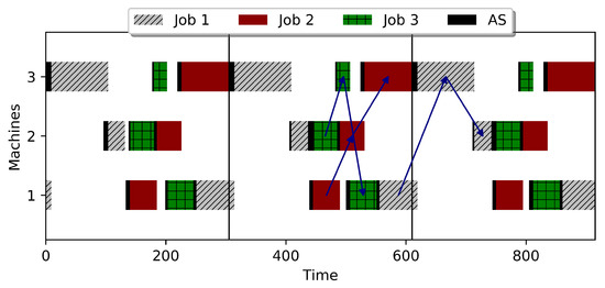 Additionally, a job cannot be loaded on the next machine before doing AS, even if both job and next machine are available. Therefore, as pointed in Figure 3, AS can cause blocking conditions. To ensure these restrictions, the inequalities in Equation (14) were modified as Equation (20).